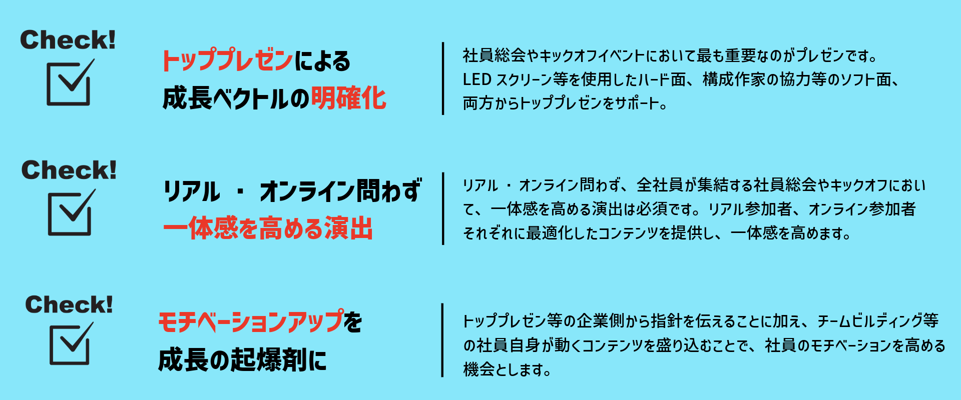 組織にとって欠かせない重要なイベント。 参加者の心を動かすエモーショナルな表彰式を通じて、 社員とステークホルダーの意欲を高め、企業の成長を加速させるイベントを企画・設計します。